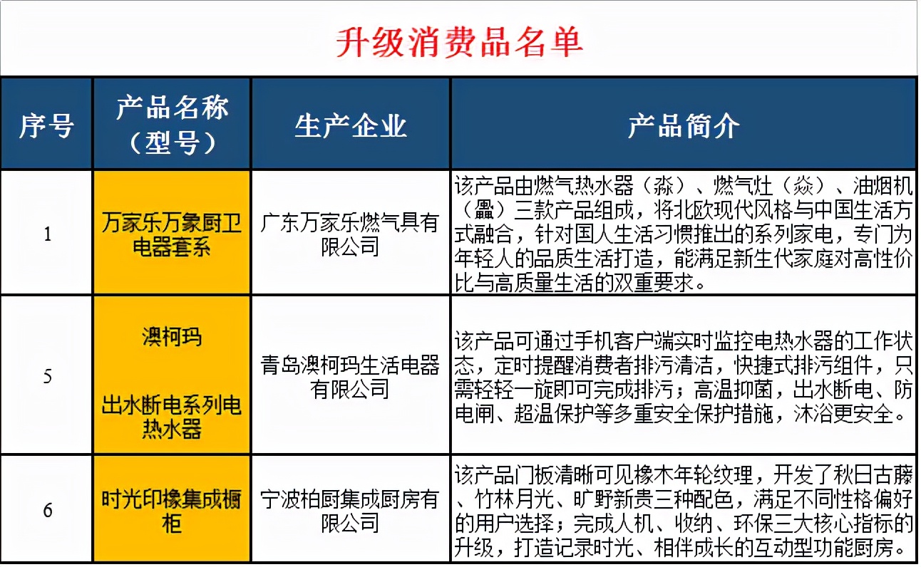 这10项产品中,3项升级消费品分别是万家乐万象厨卫电器套系、澳柯玛出水断电系列电热水器、柏厨时光印橡集成橱柜;