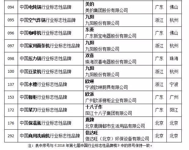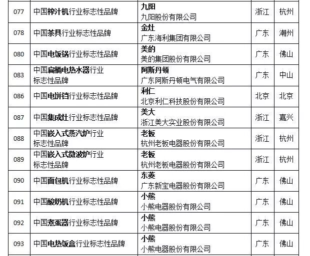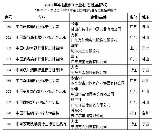 比如,方太被评为吸油烟机,家用洗碗机行业标志性品牌、老板被评为嵌入式蒸汽炉、嵌入式微波炉行业标志性品牌、华帝被评为燃气灶行业标志性品牌、万和被评为燃气热水器行业标志性品牌、美大被评为集成灶行业标志性品牌、海尔被评为电热水器行业标志性品牌、安吉尔被评为净水器行业标志性品牌等等。