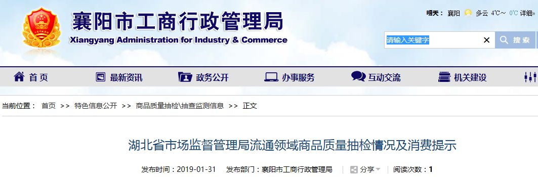 2019年1月31日,襄阳市工商行政管理局官网于公布了湖北省市场监督管理局流通领域商品质量抽检情况及消费提示: