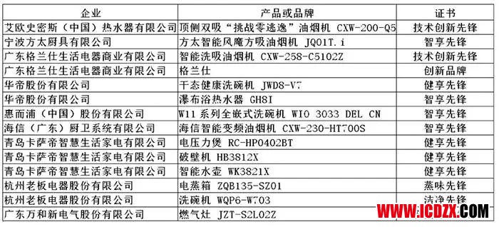 被评为“先锋”产品的9家企业分别是方太、老板、华帝、万和电气、A.O.史密斯、格兰仕、惠而浦、海信、卡萨帝,产品则涵盖油烟机、洗碗机、热水器、电压力煲、破壁机、水壶、电蒸箱、燃气灶等;被评为“创新品牌”的是格兰仕。